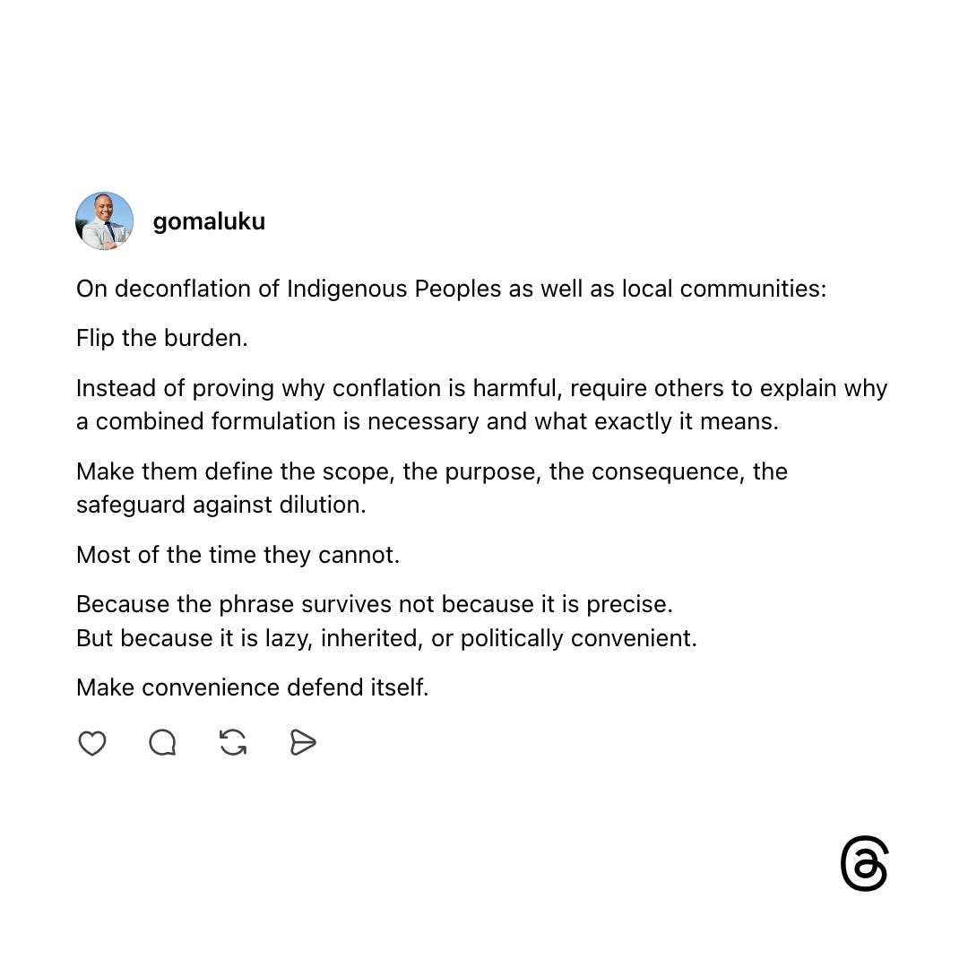 The moral argument says: Indigenous Peoples are not the same as local communities. Our rights are distinct. Our histories are distinct. Conflating us erases that.